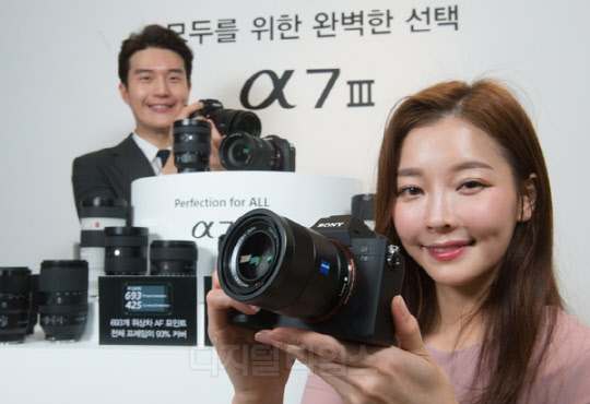 소니코리아가 서울 중구 웨스틴조선 호텔에서 풀 프레임 미러리스 카메라 'a7 Ⅲ' 출시 행사를 열고 오는 20일부터 한정 수량 예약판매 이벤트를 실시한다고 19일 전했다. 'a7 Ⅲ'는 새롭게 개발한 35mm 2,420만 화소 이면조사 엑스모어(Exmor) R CMOS 센서를 탑재했으며 초당 최대 10연사(AF/AE 추적) 무소음 촬영, 693개 위상차 및 425개 콘트라스트 AF 포인트 적용, 향상된 얼굴인식, Eye-AF 기능 등을 지원한다. 이날 행사에서 모델들이 'a7 Ⅲ'를 선보이고 있다.