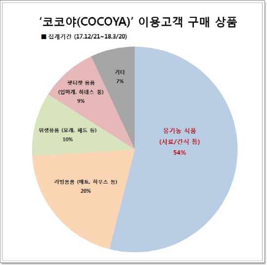 특히 여성 고객 비중은 전체 89%를 차지했다. 구매 상품은 사료·간식 등 유기농 식품(54%) 다음으로 매트·하우스 등 리빙용품(20%), 모래·패드 등 위생용품(10%)을 가장 많이 산 것으로 조사됐다. 1회당 평균 구매금액은 약 8만2000원으로 집계됐다. 종별로 살펴보면, 반려견과 반려묘의 상품 구매 비중은 8:2였다. 이중 반려견 상품의 경우 40대 여성이 가장 많이 구매했으며, 반려묘의 경우 30대 남성의 구매 비중이 가장 컸다.
