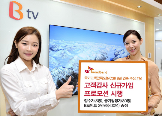 SK브로드밴드는 8년 연속 NCSI 1위 수상을 기념해 고객 감사 프로모션도 진행한다. 이달 27일부터 30일까지 4일간 B tv와 옥수수의 모든 고객을 대상으로 '라라랜드', '흥부', '아이 캔 스피크', '킬러의 보디가드' 등 인기영화 4편을 무료로 제공한다.