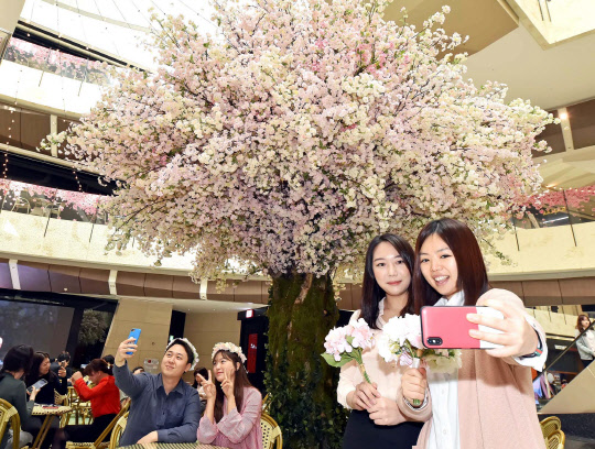 여의도 IFC몰이 봄 벚꽃놀이 시즌을 맞아 대형 벚꽃 트리와 벚꽃 로드를 설치했다고 27일 전했다. 이번 벚꽃 장식은 매년 심해지는 황사, 미세먼지로 봄철 외부 활동을 꺼리는 고객들이 실내에서 마음껏 꽃놀이를 즐길 수 있도록 마련됐다. 방문객들이 벚꽃 트리 앞에서 셀카를 찍고 있다.