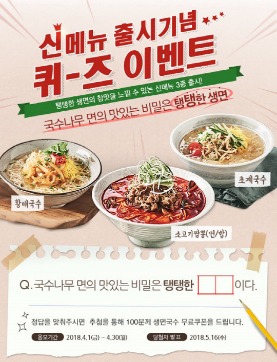 공식 홈페이지에서는 4월 1일부터 30일까지 한 달간 '신메뉴 출시기념 퀴즈이벤트'를 진행한다. '국수나무 면의 맛있는 비밀은 탱탱한 □□이다' 정답을 맞추면 추첨을 통해 생면국수 무료 쿠폰을 증정할 예정이다.