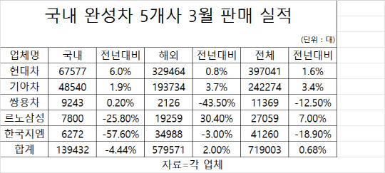 2일 현대·기아차, 한국지엠, 쌍용차, 르노삼성 등 국내 완성차 5개사가 발표한 3월 판매 실적을 집계한 결과 이들 업체의 판매량은 전년 같은 달보다 0.68% 증가한 71만9003대로 나타났다. 국내 판매가 4.44% 감소한 13만9432대에 그쳤지만, 해외 판매가 57만9571대로 2% 증가하며 전체 실적 증가를 이끌었다.