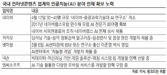 삼성전자와 애플, 구글, 아마존 등 IT 공룡들이 AI 인재 확보에 사활을 걸고 있는 가운데, 국내 인터넷 콘텐츠 기업들도 관련 인력 확보에 속도를 내고 있다.