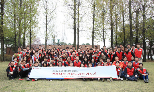 롯데홈쇼핑은 지난 6일 서울 영등포 선유도공원에서 '선유도공원 가꾸기' 봉사활동을 진행했다. 이날 봉사활동 현장에서 회사 임직원들이 기념촬영을 하고 있다.