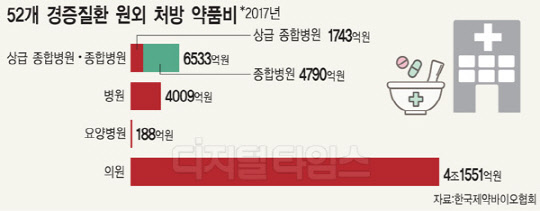 그러나 최근 제약업계는 문재인 케어에 따른 의약품 처방 형태 변화가 이뤄질 것이란 예상이다. 우선 정부는 국민들이 경증까지도 대형병원에만 몰리는 쏠림현상을 완화하는 방안을 마련할 방침이다. 우선 병원급 이상에서 만성질환같이 경미한 진료를 보면 진료수가에 불이익을 주는 방안 등 검토하고 있다. 이에 따라 앞으로 상급종합병원 및 종합병원에서 고혈압, 당뇨 등과 같은 경증질환의 진료가 줄어들면, 작년 기준 상급 종합병원 1743억원, 종합병원 4790억원 총 6500억원 규모의 경증질환 원외 처방 약품비가 의원과 요양병원 등으로 이동할 전망이다. 제약업계 관계자는 "일례로 경증질환 중 만성질환은 제일 큰 제약업계의 수익원인데 만성질환의 처방형태가 바뀌면 직간접적으로 제약업계가 받는 영향도 클 것"으로 관측했다