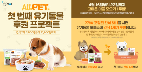 CJ몰의 반려동물 전문몰 '올펫'이 오는 22일까지 '유기동물 후원 프로젝트 1탄' 기획전을 진행한다.