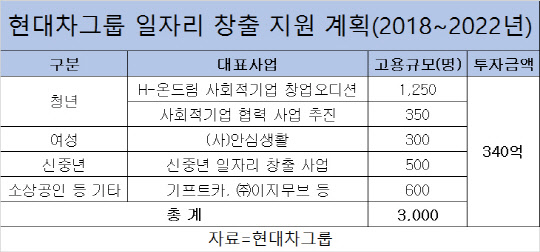 현대차그룹은 2022년까지 5년 동안 340억원을 투자해 새 일자리 3000개를 창출할 계획이라고 19일 밝혔다. 이를 위해 △사회적 기업 성장 단계별 지원 △일자리 창출형 사회적 기업 육성 △재취업 일자리 창출 모델 구축 △소상공인 창업 지원 등을 집중 추진한다.