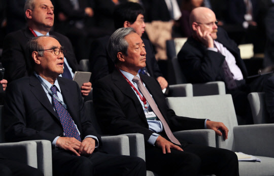 국내 민간 싱크탱크인 아산정책연구원은 24∼25일 서울 그랜드하얏트호텔에서 '비자유주의 국제질서(Illiberal International Order)'를 주제로 '아산 플래넘 2018'을 개최했다. 24일 정몽준 아산재단 이사장(왼쪽 두번째)이 에드윈 퓰너 미국 헤리티지재단 설립자의 기조연설을 듣고 있다.