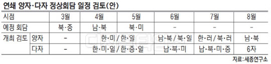 한미정상회담은 5월 중순으로 예상되나 도널드 트럼프 대통령이 미북회담 일정을 앞당기면 함께 조정될 것으로 보인다. 한일 또는 한중일 회담은 5월 초에 열릴 것으로 전해졌다. 남북미 회담 시기는 미북회담 시기나 결과에 따라 정해질 전망이다. 남북미중 회담은 7월이 유력하고 그 사이 한러· 북러 정상회담이 열릴 가능성이 높다.