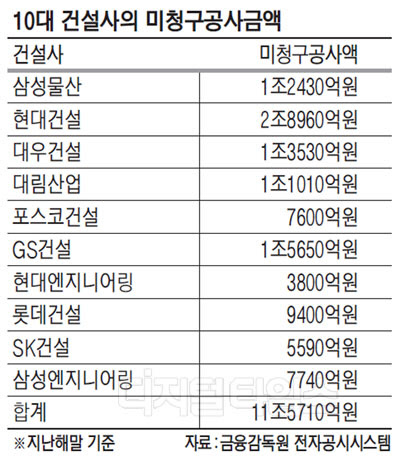 국내 건설사들의 미청구공사금액이 여전히 두 자릿수에 머물고 있는 것으로 나타났다. 미청구공사금액은 공사를 하고서도 아직 발주처에 기성금을 요청하지 않은 금액이다.