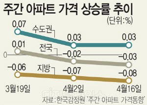 지방 아파트 가격의 하락세는 더욱 뚜렷하다. 2018년 1월 22일 조사에서 이미 전주 대비 -0.03%의 상승률을 기록하면서 실질적인 가격 하락세를 나타낸 이후 지속적으로 하락해 3월 26일에는 -0.07%를 기록했으며, 4월 이후 하락 폭은 더욱 확대됐다. 수도권은 미미하나마 여전히 상승세를 보이고 있으나 상승률은 크게 둔화됐다. 금년 1월 22일 0.16%를 기록했던 수도권의 주간 아파트 가격 상승률은 2월 26일에는 0.10%로 상승폭이 둔화됐으며, 3월 26일에는 0.05%로 다시 내려앉았다. 다주택자에 대한 중과세 정책 시행된 이후인 4월 16일에 발표된 수도권 아파트 가격 상승률은 0.03%까지 떨어졌다.
