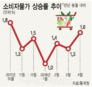 2일 통계청의 '4월 소비자물가동향'에 따르면 지난달 물가 상승률은 전년 동월 대비 1.6% 올라 6개월 만에 가장 높은 수치를 보였다. 지난해 같은 기간과 비교한 소비자물가 상승률은 2017년 9월 2.1%를 기록한 뒤 올해 4월까지 7개월 연속 1%대를 기록했다. 자주 구입하고 지출 비중이 큰 140개 품목을 토대로 작성하는 생활물가 지수도 1.4% 상승했다.