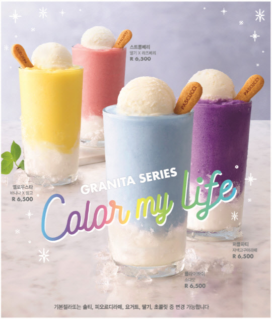 '컬러 마이 라이프' 그라니따는 재료의 색을 파스텔 톤으로 표현했다. '스트롱베리(6500원)'는 딸기와 라즈베리를 함께 넣어 상큼하다. '옐로우스타(6500원)'는 바나나와 망고를 섞어 달콤하다. '플라이하이(6500원)'는 파란 하늘을 연상시키는 소다 맛을 느낄 수 있다. '퍼플파티(6500원)'는 자색 고구마 라떼 맛을 담았다.