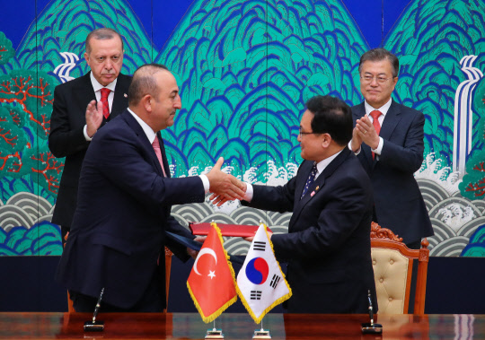 문재인 대통령과 한국을 국빈 방문중인 레제프 타이이프 에르도안 터키 대통령이 2일 청와대에서 열린 한·터키 ICT(정보통신기술) MOU(양해각서) 체결식에서 유영민 과기정통부 장관과 메블룻 차부쉬 오울루 터키 외교부 장관의 서명서 교환을 축하하고 있다.