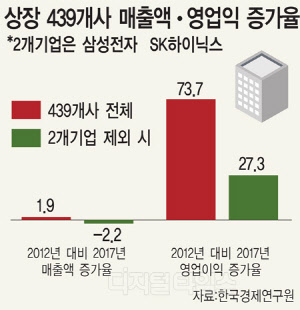 전체 영업이익에서 삼성전자와 SK하이닉스가 차지하는 비중도 절반으로 커졌다. 나머지 기업의 영업이익 비중은 두 기업을 합친 것에 미치지 못했다. 삼성전자와 SK하이닉스의 영업이익은 지난 2012년 17조9000억원으로 전체의 32.7%를 차지했으나 5년 동안에 48조2000억원(50.7%)까지 늘었다. 두 기업을 뺀 437개사의 영업이익은 36조8000억원에서 46조8000억원으로 소폭 늘었지만 비중은 오히려 67.3%에서 49.3%로 큰 폭으로 감소했다.