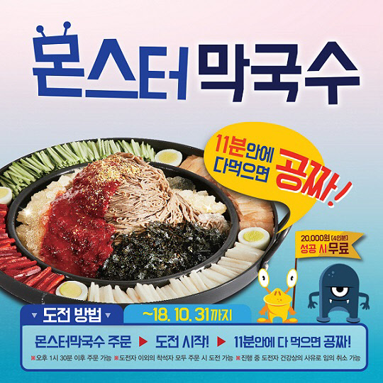 지난 2017년 여름 몬스터철판볶음밥 출시와 함께 방송, 유튜버 및 SNS 영상을 통해 많은 사람들이 먹방에 도전했으며, 이후 해당 메뉴도 추가했으면 좋겠다는 문의가 이어졌다. 이에 고객의 의견을 적극 반영하고자 해당 브랜드는 시원하고 재미있는 여름 이벤트 메뉴로 물막국수 4인분을 11분 안에 먹는 '몬스터막국수'를 선보인다.