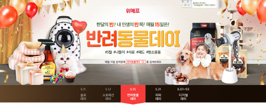 이밖에 위메프는 반려동물데이 기획전 딜에 댓글을 단 고객 30명을 추첨해 강아지-고양이 럭키박스를 준다. 럭키박스는 사료, 간식, 패드, 미용용품 등 약 10종으로 구성됐다.