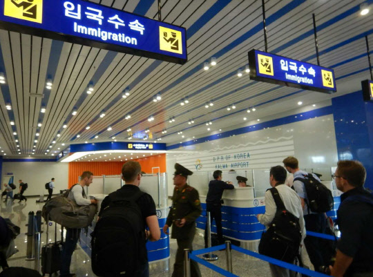북한 풍계리 핵실험장 폐기 현장을 참관하기 위해 22일(현지시간) 오전 중국 베이징 서우두 공항을 출발한 외신기자단이 북한 원산 갈마공항에 도착해 입국 수속을 받고 있다. 당초 외신기자단에 합류하기 위해 베이징에서 대기하던 한국기자단은 북측으로 부터 비자를 발급받지 못해 방북하지 못했다.