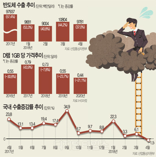 이로 인해 반도체 수출 증가율도 작년 57.5%에서 올해 4월 37.0%로 상승곡선이 완만해졌다. 작년과 같은 폭발적 성장을 기대하긴 어렵다는 뜻이다.