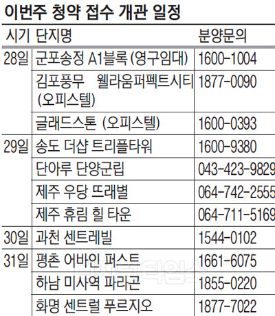 대우건설은 같은 날 부산 화명동에서 화명 센트럴 푸르지오 1순위 청약을 받는다. 단지는 지하 3층∼지상 35층, 9개동, 886가구 중 642가구가 일반 분양된다. 부산 지하철 2호선 화명역과 가까우며 화명초, 화신중, 화명고교 등 도보 통학 거리가 학군이 형성됐다.현대엔지니어링은 31일 대구 범어동에서 힐스테이트 범어 견본주택을 연다.