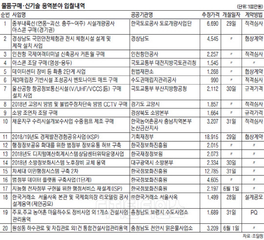 물품구매로는 경상남도의 '국민안전체험관 전시 체험시설 설계 및 제작설치사업'이 45억4500만원 규모로, 협상계약을 통해 오는 29일 개찰한다. 또 경기도 고양시의 '방범 및 불법 주정차 단속방범 CCTV 구매'가 18억5700만원 규모로, 적격심사를 통해 집행된다.