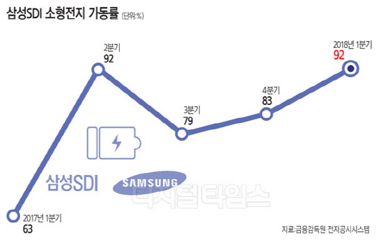 29일 금융감독원에 따르면 삼성SDI의 에너지솔루션 사업부는 올해 1분기 소형 배터리(원통형, 각형 등) 3억3400만개를 생산해 평균 가동률 92%를 기록했다. 가동률은 2011년 이후 1분기 기준으로 역대 최대치이며, 작년 2분기와 같은 숫자다. 업계에 따르면 스마트폰용으로 주로 쓰이는 소형 배터리 사업은 신제품 출시 직전인 1월까지는 비수기였다가, 2월 주요 업체들의 신제품 출시 이후 본격적으로 수요가 늘어 2분기까지 성수기에 진입한다. 하지만 올해는 1분기부터 수요가 급증하고 있어 2분기에는 공급부족 상황까지 발생할 가능성이 있다고 업계는 예상했다. 업계는 통상 배터리 생산라인 가동률이 90%를 넘으면 증설 시점으로 보고 있다.