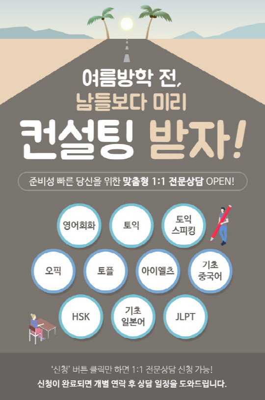 전문상담은 5월 31일부터 신청 가능하며, 6월 말까지 이어진다. 상담은 주요 과목인 토익 이외에도 영어회화, 토익스피킹, 오픽, 토플, 아이엘츠(IELTS), 중국어, 일본어 등이 해당된다.