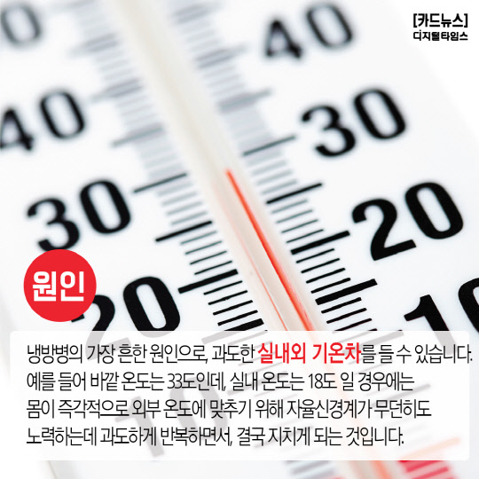 냉방병의 가장 흔한 원인으로, 과도한 실내외 기온차를 들 수 있습니다. 예를 들어 바깥 온도는 33도인데, 실내 온도는 18도 일 경우에는 몸이 즉각적으로 외부 온도에 맞추기 위해 자율신경계가 무던히도 노력하는데 과도하게 반복하면서, 결국 지치게 되는 것입니다.