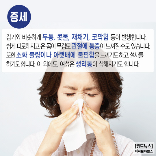 감기와 비슷하게 두통, 콧물, 재채기, 코막힘 등이 발생합니다. 쉽게 피로해지고 온 몸이 무겁도 관절에 통증이 느껴질 수도 있습니다. 또한 소화 불량이나 아랫배에 불편함을 느끼기도 하고, 설사를 하기도 합니다. 이 외에도, 여성은 생리통이 심해지기도 합니다.