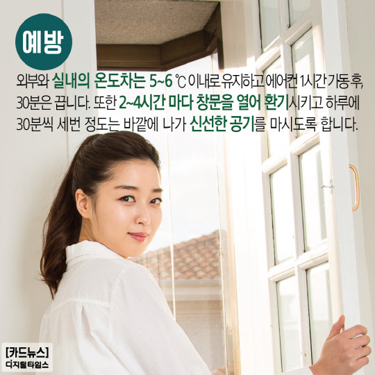 외부와 실내의 온도차는 5~6 ℃ 이내로 유지하고 에어컨 1시간 가동 후, 30분은 끕니다. 또한 2~4시간 마다 창문을 열어 환기시키고 하루에 30분씩 세번 정도는 바깥에 나가 신선한 공기를 마시도록 합니다.