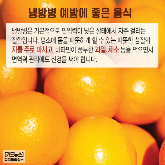 냉방병은 기본적으로 면역력이 낮은 상태에서 자주 걸리는 질환입니다. 평소에 몸을 따뜻하게 할 수 있는 따뜻한 성질의 차를 주로 마시고, 비타민이 풍부한 과일, 채소 등을 먹으면서 면역력 관리에도 신경을 써야 합니다.
