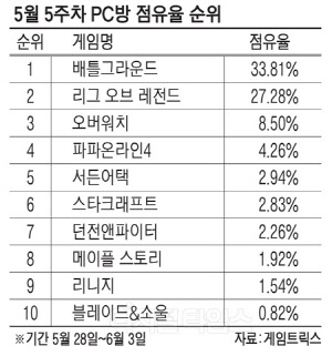[디지털타임스 심화영 기자]서바이벌 슈팅 게임 '배틀그라운드'가 6개월째 국내 PC방 게임 순위 1위를 수성하고 있다. 이 게임은 카카오게임즈가 국내 서비스를 하고 있다. 6일 PC방 전문 집계사이트 게임트릭스에 따르면 배틀그라운드의 5월 다섯째 주 PC방 점유율은 33.81%로 집계됐다.