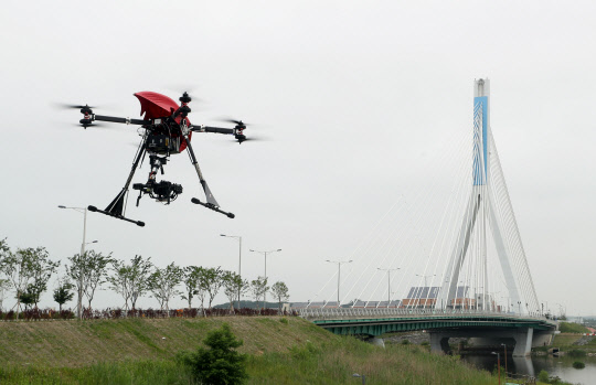 7일 오전 인천시 서구 공촌4교에서 열린 '국토교통부·한국교통안전공단 드론 활용 항공장애표시등 관리검사 시연회'에서 드론이 교량에 설치된 항공장애표시등을 향해 비행하고 있다. 항공장애표시등은 항공기 조종사가 고층 장애물을 인지하고 회피할 수 있도록 높은 구조물에 설치되는 표시등이다.
