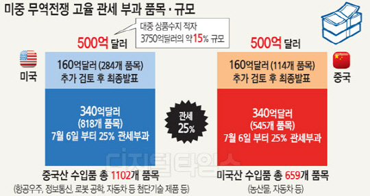 미국과 중국 간 무역전쟁이 결국 현실화하면서 우리 수출에 빨간불이 켜졌다. 특히 미국이 중국의 첨단산업 품목에 25% 관세 폭탄을 집중 투하하면서, 우리나라와 중국 간 경쟁 관계에 있는 TV, 휴대전화 등은 관세 대상에서 제외해 우리나라로선 최악의 시나리오가 나온 셈이다.