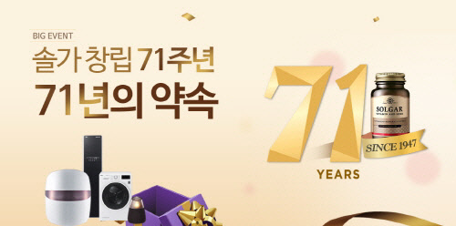 먼저, 전 제품 30~50% 할인 이벤트를 진행한다. 특히 올해 100만 병 판매를 돌파한 프리미엄 비타민C '솔가 에스터C'는 71주년을 맞아 71%의 특별 할인가에 제공한다.