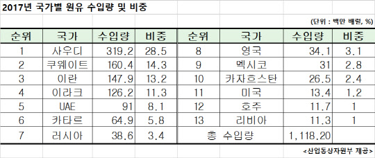 우리나라의 이란산 원유수입은 2017년 1억4787만 배럴로 전년보다 32.1% 증가했다. 사우디아라비아와 쿠웨이트 다음으로 많으며 전체 원유수입의 13.2%를 차지했다. 올해 1∼5월 수입량은 4천450만 배럴로 전체 원유수입의 9.7%다.
