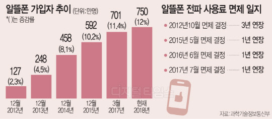 알뜰폰 업계는 그동안 1년에 약 345억원 정도의 전파사용료를 면제받아 왔다. 과기정통부가 알뜰폰의 시장 안착을 위해 면제를 계속 연장해왔기 때문이다. 특히 2012년에 전파사용료를 3년간 면제한 후 매년 1년씩 추가로 연장해왔다. 가장 최근에는 지난해 7월 입법 예고한 전파법 시행령 일부 개정안을 통해 올 9월까지 면제 기한을 연기한 상태다. 면제 금액은 가입자당 461원으로 현재 알뜰폰 가입자 750만 명이 감면 혜택을 보고 있다.