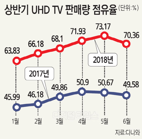 1일 업계에 따르면 올 상반기 평균 UHD TV 판매량 점유율이 전년 동기에 비해 20% 포인트 가량 증가했다. 가격 비교 사이트 다나와에 따르면 올들어 6월까지 TV 시장에서 UHD TV 판매량 점유율은 평균 69.33% 인 것으로 집계됐다. 지난해 같은 기간 점유율 48.88%에서 20% 포인트 이상 껑충 뛴 것이다.