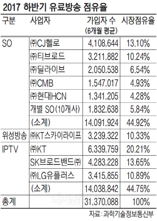 업계는 KT가 초고속 인터넷 1위 사업자라는 점 또한 우려하고 있다. IPTV와 초고속인터넷 결합 상품을 이용하는 사람들이 많은 만큼, 유료방송 시장에서 앞으로 KT의 지배력이 점점 늘어날 수 있기 때문이다. 현재 KT는 초고속인터넷 시장의 41% 이상을 점유하고 있다.
