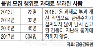 금융감독원에 따르면 지난해 신용카드 불법모집 신고센터를 통해 접수된 불법 카드 모집인 중 금감원이 과태료를 부과한 사람은 504명에 달했다. 2013년 22명, 2014년 32명, 2015년 45명 등 매년 증가 추세다.