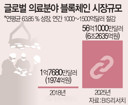 4일 시장조사업체 BIS리서치에 따르면 글로벌 의료분야에서 블록체인 기술을 도입한 곳은 올해 14%에 불과하지만, 오는 2020년까지 약 70%의 의료기관에서 블록체인을 활용해 매년 110조~167조원의 경제 효과를 얻을 것으로 전망됐다. 블록체인으로 데이터 유출과 IT 운영 비용 감소, 브로커 및 보험 사기방지 등의 효과를 볼 수 있다는 게 BIS리서치의 분석이다.