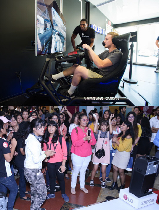 오른쪽 사진은 인도 뉴델리 시리포트 오디토리움에서 열린 '2018 창원 케이팝 월드 페스티벌 인도' 행사장에서 관객들이 LG전자 엑스붐 스피커에서 나오는 음악을 듣고 있다.