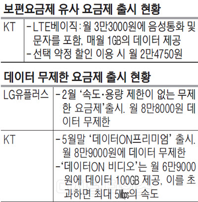 LG유플러스는 지난 2월 속도·용량 제한이 없는 무제한 요금제를 내놓고, U+프로야구 등 맞춤형 서비스를 내놨다. KT 또한 지난 5월 무제한 요금제를 선보이는 동시에 6만원대에 데이터 100GB를 제공하는 요금제까지 내놨다. 특히 KT의 '데이터 ON'은 출시 한 달 만에 50만 명이 넘는 가입자를 끌어모았다.