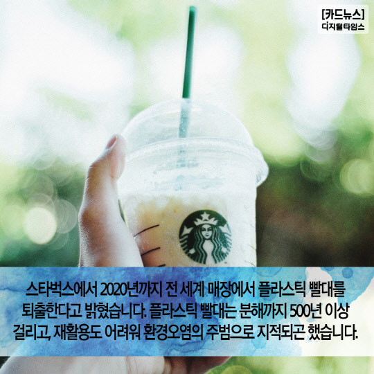 1. 스타벅스에서 2020년까지 전 세계 매장에서 플라스틱 빨대를 퇴출한다고 밝혔습니다. 플라스틱 빨대는 분해까지 500년 이상 걸리고, 재활용도 어려워 환경오염의 주범으로 지적되곤 했습니다.