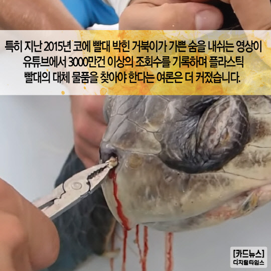 2. 특히 지난 2015년 코에 빨대 박힌 거북이가 가쁜 숨을 내쉬는 영상이 유튜브에서 3000만건 이상의 조회수를 기록하며 플라스틱 빨대의 대체 물품을 찾아야 한다는 여론은 더 커졌습니다. 유튜브캡쳐