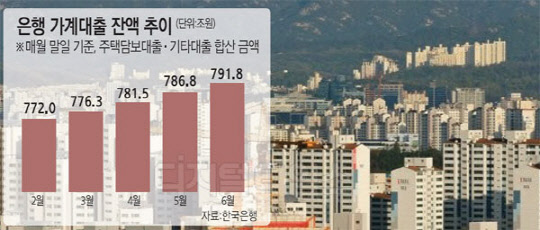 올해 상반기에만 가계대출이 34조원에 육박하는 수준으로 늘어나면서 지난 6월말 현재 우리나라 전 금융권 가계대출 잔액이 800조5000억 원으로 집계됐다.