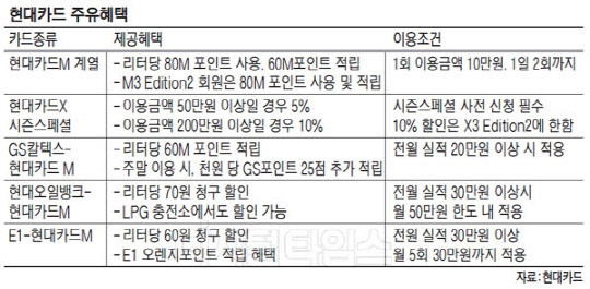 이와 함께 주유 제휴카드도 함께 선보인다. GS칼텍스-현대카드M 카드는 GS칼텍스에서 주유 시 리터당 60 M포인트 적립 혜택은 물론, 전월 20만원 이상 사용 시 리터당 GS포인트 5점을 쌓아준다. 현대오일뱅크-현대카드M 카드 고객은 현대오일뱅크 주유 시 리터당 70원의 청구 할인 혜택을 받을 수 있다. 또 M포인트 활용이 가능한 현대카드를 보유한 고객은 GS칼텍스에서 리터당 80 M포인트 사용과 60 M포인트 적립 혜택을 동시에 누릴 수 있다.