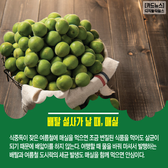 식중독이 잦은 여름철에 매실을 먹으면 조금 변질된 식품을 먹어도 살균이 되기 때문에 배앓이를 하지 않는다. 여행할 때 물을 바꿔 마셔서 발행하는 배탈과 여름철 도시락의 세균 발생도 매실을 함께 먹으면 안심이다.
