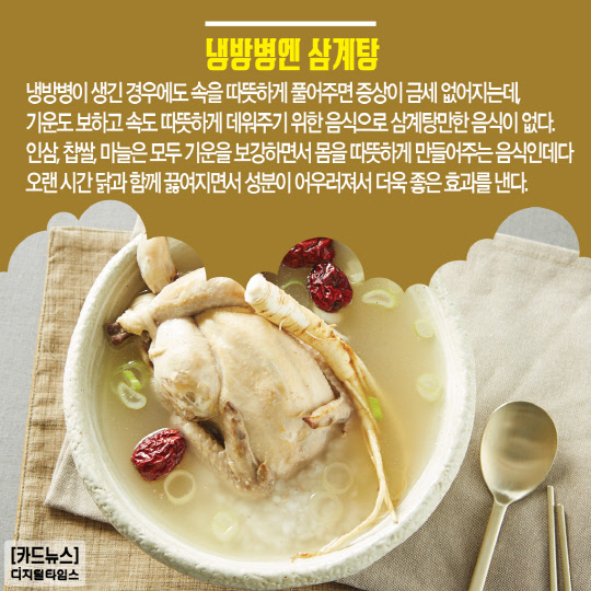 냉방병이 생긴 경우에도 속을 따뜻하게 풀어주면 증상이 금세 없어지는데, 기운도 보하고 속도 따뜻하게 데워주기 위한 음식으로 삼계탕만한 음식이 없다. 인삼, 찹쌀, 마늘은 모두 기운을 보강하면서 몸을 따뜻하게 만들어주는 음식인데다 오랜 시간 닭과 함께 끓여지면서 성분이 어우러져서 더욱 좋은 효과를 낸다.