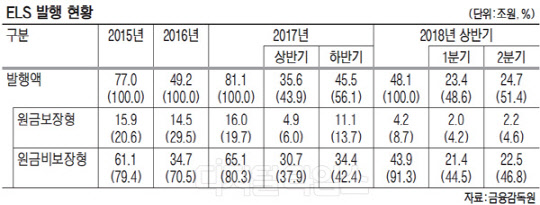 특히 H지수를 활용한 ELS 발행액은 올해 상반기 34조2000억원으로 지난해 하반기 8조5000억원의 4배로 급증했다. 금감원 관계자는 "최근 미중 통상마찰 등으로 H지수가 하락하면서 투자자가 만기에 손실을 볼 수 있는 구간(녹인)에 진입할 가능성이 더욱 커지고 있다"며 "쏠림 현상에 대한 적절한 대응이 필요하다"고 강조했다.